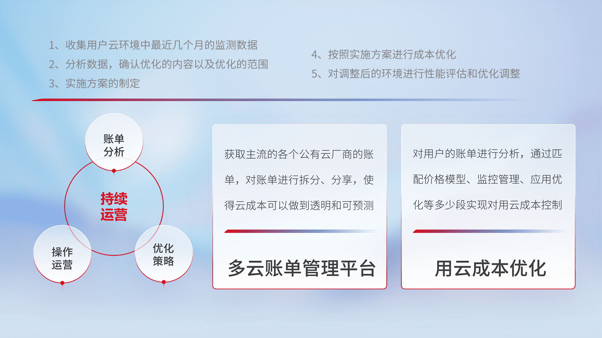 通过多云纳管,,以统一的资源数据模型把客户的云资源进行抽象和封装,,,,进而实现对多云资源的统一操作,,保障云资源管理的可靠性、、、、稳定性与可用性。。量身定制化运维内容,,配置、、开发运维、、补丁管理、、、、备份、、监控、、认证和访问管理、、、审计和日常巡检等,,保障在用云过程中的可靠度,,稳定度以及高可用率。。