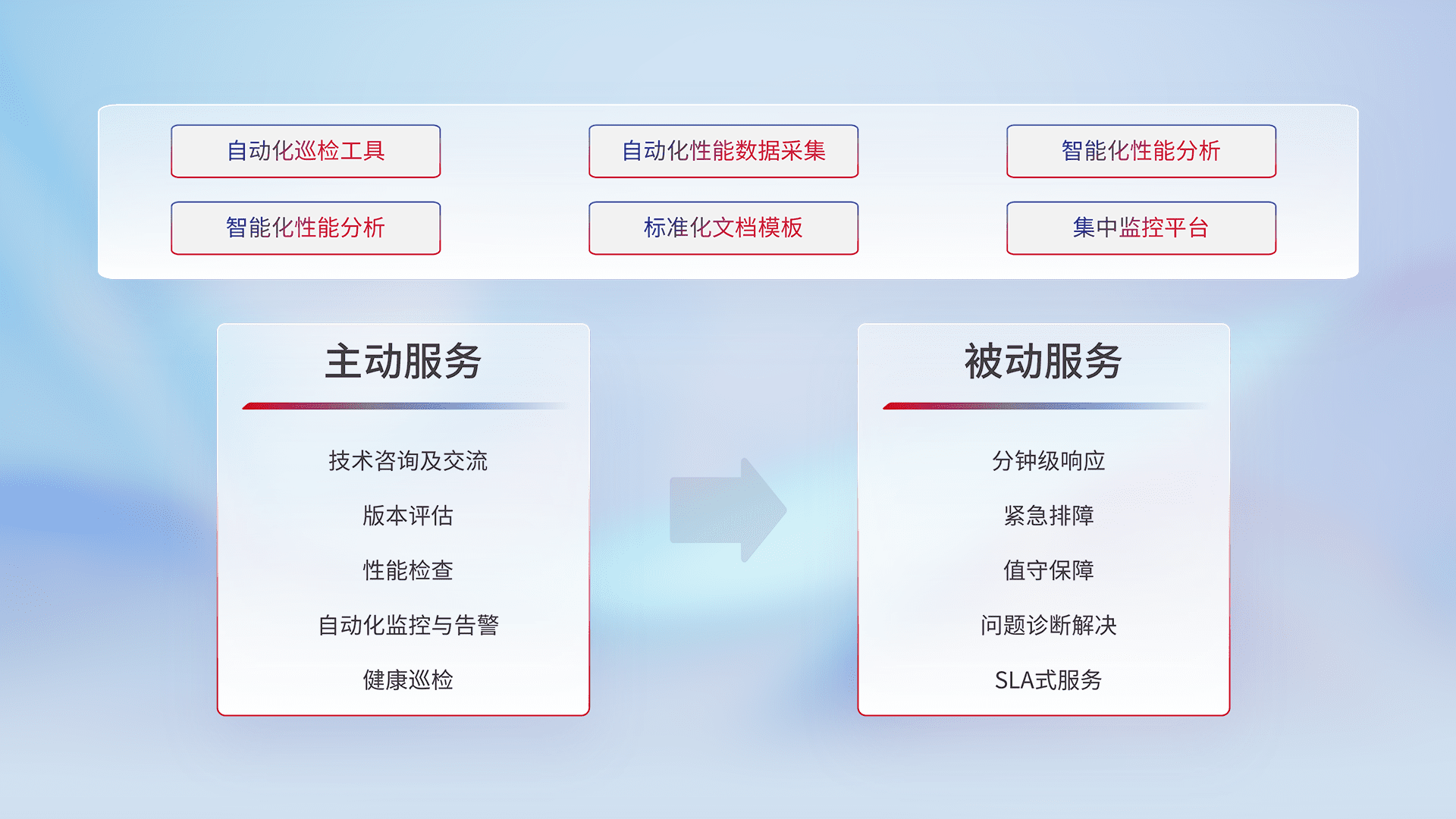 智能化工具和标准化文档,,保障服务质量,,提供主动服务(包含技术咨询、、、版本评估、、性能检查、、、自动化监控与告警、、、、健康巡检)和被动服务包含(分钟级响应、、、紧急排障、、、值守保障、、、、问题诊断解决、、、、SLA服务)。。